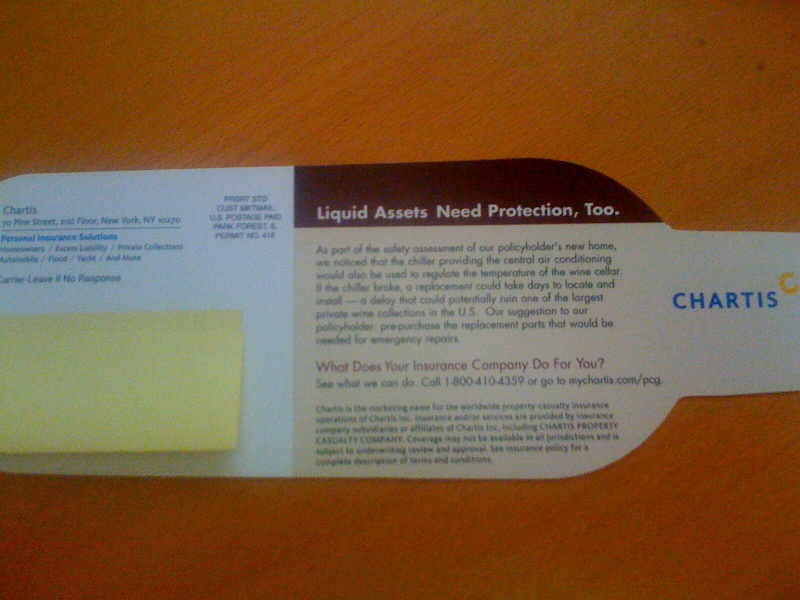 I got this wine bottle-shaped flier in my mail last week, did you? At first glance I thought it was a unique way to get my attention to buy wine. Hard card stock, printing on both sides – though the reverse is just a bottle of Moraga Bel Air 1997 with the words, “What Does Your Insurance Company Do For You? Chartis, Your world, insured.”