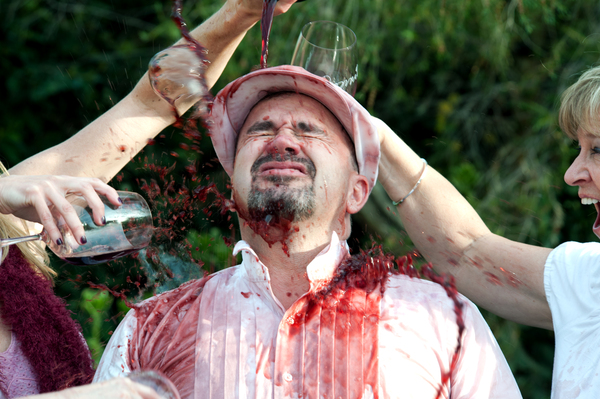 Photo FOUR (Final): I had to kiss that face goodbye – sticky – while revelers enjoyed ear licking, hollering and, of course, more splashing before a change of clothes. In conclusion, I was drawn to these people for their love of playing! But, for me, I have to admit, I found the idea of pouring out wine this way, no matter how bad it may have been, somewhat blasphemous…but, then again, maybe I just need to learn how to play better with others. This photo of Doug says it all, a lover of wine yes, but a lover or life, YES!!!! The last thing I remember him saying was, “At the count of three – SPLASH!” and a minute later, “Now, I need a group hug from all that splashed me!”