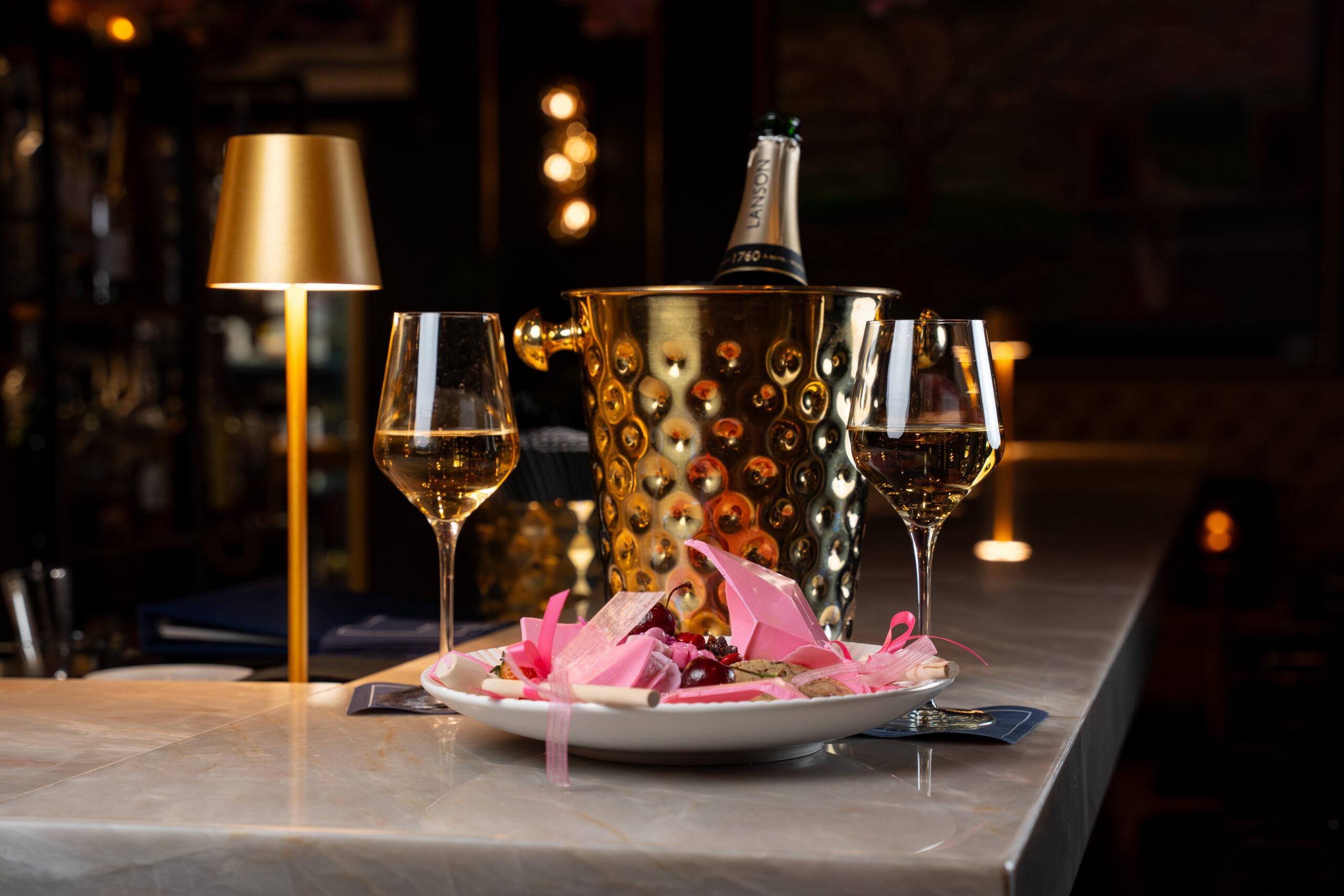 Designed as a shared experience, Love You to Pieces unfolds inside the lounge’s intimate setting and pairs two glasses of brut Lanson Champagne with a theatrical dessert presentation. Guests crack open a pink chocolate heart to reveal hidden truffles and a selection of decadent sweets, turning dessert into a moment of surprise and connection. The champagne’s crisp notes naturally complement rich chocolate and ganache, rounding out the experience.