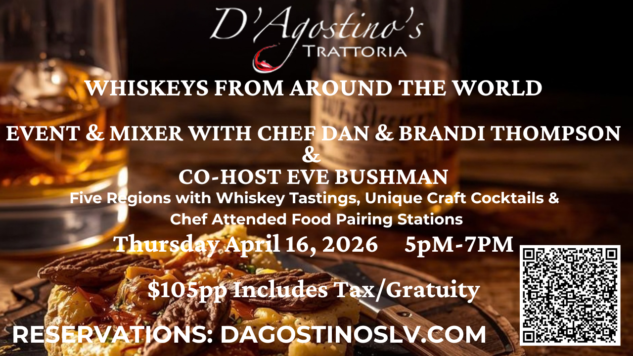 Owners Brandi & Chef Dan Thompson, the D’Agostino’s culinary & mixology team, and co-host, WSET certified Eve Bushman, purveyors of fine whiskeys, and local experts bring together exceptional selections from fine whiskey distillers (sips and cocktails) with food pairings for a fun evening of stories, experiences, and anecdotes!